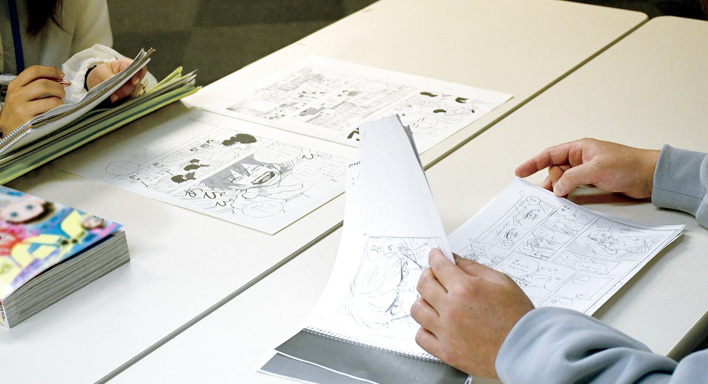 マンガ専攻はストーリーの作り方や、アイデア出しの方法、モノクロ背景の描き方などを身につける。